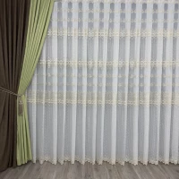 Основа гардини - бамбук, тонка та легка тканина з чітко вираженим полотняним плетінням волокон та матовою поверхнею. Смужки більш чіткі ніж основа, мають сітчасту структуру з рельєфним фактурним візерунком. Тюль виглядає повітряно, натурально, самобутньо і дуже стильно.