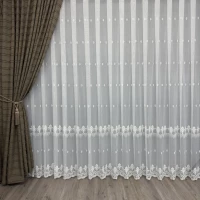 Основа гардини - бамбук, тонка та легка тканина з чітко вираженим полотняним плетінням волокон та матовою поверхнею. Смужки більш чіткі ніж основа, мають сітчасту структуру з рельєфним фактурним візерунком. Тюль виглядає повітряно, натурально, самобутньо і дуже стильно.