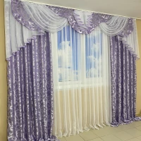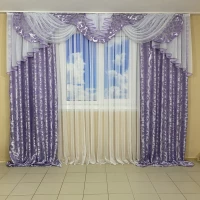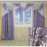 В комплект входить ламбрекен шириною 3м, дві штори по 1,50 м шириною і 2,70 м заввишки і два підхоплення.