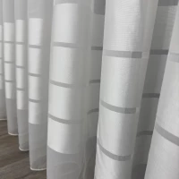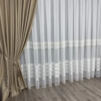 Основа гардини — тонка і легка тканина з чітко вираженим полотняним плетінням волокон і матовою поверхнею. Кольорові смужки, мають сітчасту структуру з рельєфним фактурним візерунком. Тюль виглядає повітряно, натурально, самобутньо і дуже стильно.