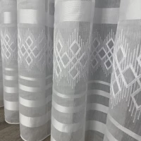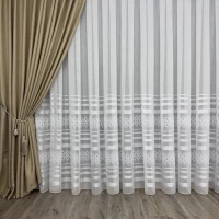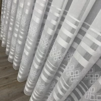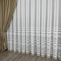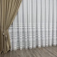 Основа гардини — тонка і легка тканина з чітко вираженим полотняним плетінням волокон і матовою поверхнею. Кольорові смужки, мають сітчасту структуру з рельєфним фактурним візерунком. Тюль виглядає повітряно, натурально, самобутньо і дуже стильно.