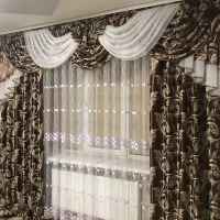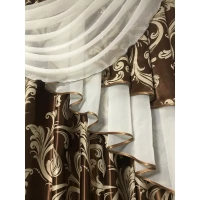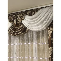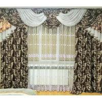 В комплект входить ламбрекен шириною 3м, дві штори по 1,50 м шириною і 2,70 м заввишки і два підхоплення.