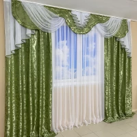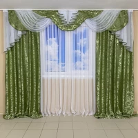 В комплект входит ламбрекен 3м шириной, две шторы по 1,50м шириной и 2,70м высотой и два подхвата.