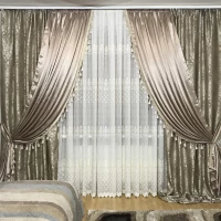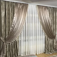 В комплект входит: две плотные шторы из плотной жаккардовой ткани и две атласные шторы декорированные бахромой.