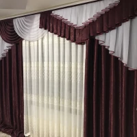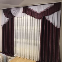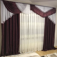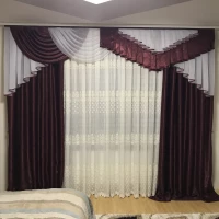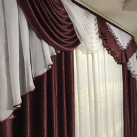 Комплект: ламбрекен-1шт, шторы-2шт Размер: ламбрекен не регулируется 3м по карнизу. Шторы две по 1,50м шириной м 2,70м высотой Способ подвеса: тесьма Ткань: Блекаут+шифон Цвет: бордовый